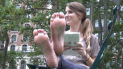 I began shooting and like I said she was wriggling and flexing those big feet around. Big frisky soles! She was watching something on her iPad I think. Eventually she noticed the camera and you can see her look at it and then sort of look around with a little smirk on her face and then look back at the camera, but then she looked away and back at her iPad. Every once in a while she would cast a quick look at the camcorder lens but that's about it. After about nine minutes or so she smirked and slid her feet back into her big flops, and I knew it was time to go, but I left with a smile on my face -- almost ten minutes of super-big Asian soles! So rare. I imagined her Chinese grandmother and the field day she must have had teasing this lanky gal about those "banana boats!"