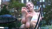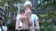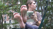 Really NOTHING doing past week or so on the lawn. It's closed so often there's really no opportunity to shoot! But this evening the lawn (finally) opened, so I was there. Still, no shooting opportunities ... except, eventually, ONE. On the southern edge of the lawn was the ONLY woman in the entire park with her shoes off and feet up. IO had been sitting in a chair about 100 feet away and got bored and so stood up and saw the soles and was like WHOAH and walked right over there. This gal was very tall, slender, with long legs, and big long feet, which were sort of awkwardly flexing and wriggling around, like Olive Oyl might do! She was sort of plain but when I see BIG bare soles like that I have to capture them, and capture them I did. And soft, tender, pampered soles they are too -- they must be SO sensitive.