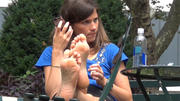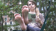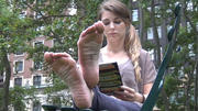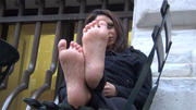 So in order to shoot the vid I would have to do the very embarrassing thing of sitting on the sidewalk and taking out a camera, which of course is what I did -- at this point I would have got naked in order to get some footage. Naturally this attracted her attention IMMEDIATELY. This is the moment of truth -- either the woman doesn't like it and puts her feet down and maybe even chews you out, or her curiosity and bemusement gets the better of her, and she leaves her feet up for the experience of having her bare soles video'ed by a stranger. To my immense relief, this girl was so sporting. She gave me the funniest looks, very sly, very bemused, the whole time. Her soles looked very soft and very sensitive, and as it turns out, my instincts were 100% right!