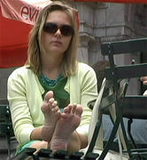 I sat down and was so excited to start I forced myself to check both my personal and work e-mail on my phone, just to increase the nonchalance of the shoot. Once that was done, I gently slid the camcorder into my lap and opened the viewfinder and was shocked to see what I saw -- I had sat much closer that I had estimated and her scrumptious, perfect bare soles were panoramically stretched across the whole viewfinder! Her pretty little head was in the foreground but still visible. This is the PRIME VIEW! I could just barely make her out as she peered down at my camera through her big shades, and so I began shooting immediately, so that if her put her feet down, I'd at least be able to extract a vidcap.