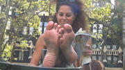 But she did not put her feet down. We sat there for about 25 minutes, the exquisite perfect gem of a woman and the big middle aged guy, her tender, sensitive, beautiful bare soles being lovingly filmed by him as she texted and occasionally peered down at the camera for a moment to see if he was still photographing her foot bottoms. At one point a guy came along and stood behind her and a little to the left and took his phone out -- it was pointed right at her feet and my suspicion is he was taking shots. I edited him out so he would not get dimed out by this clip. lol (Interestingly, when I shot her again in the fall, there was another guy also taking pics of her feet, but that guy made it obvious he was taking pictures and seems to have said something sort of rude to her because she seemed sort of put off by him.) The biggest issue was that the sun was crawling down toward the West Side and that threw a lot of funky shadows on naked soles, and other times must have been hot on her poor little soles, almost burny hot, because they were fairly GLIMMERING with sunlight. Other times the sun shone instead on the area behind her, backlighting her. But I got enough footage in which her soles are perfectly visible to yield this clip!