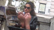 So I was talking to my friend Ariel about how I shoot candids of women's soles in public and how I get little smiles and sometimes discreet peeks from lots of them, even little wiggles and giggles sometimes. She listened intently then said that she could see how it would be seen as a compliment, and especially for a tourist -- how this might be a weird and funny experience to talk about when she got home to Minnesota or something. Then she laughed and said "I wonder how I would react!" ... and believe me I did not let that opportunity go unanswered! I set up a gig with her and even plopped her right down in a place where I catch most of my content -- to the very place where the soles are on the most ideal display (so I am more likely to actually risk sitting down and shooting). Stuck her in the chair and told her just to act naturally.