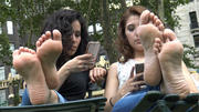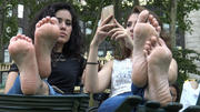 I shot this for a while and they both obviously knew what I was doing, both looking straight at the camera. I moved around a few times to get better angles and view, and they saw me doing that, but they just happily sat there. They obviously knew, but one thing I'm still not sure about is whether they knew that *each other* knew. At first I thought they both knew because the brunette pretty obviously takes a picture of me as the dark haired girl laughs her full laugh, and then they both look at the picture on her phone. But then at a later point, the brunette with the big feet looks into the camera and laughs and points to me and the dark haired girl with the little feet looks and laughs too. Now, I wonder -- did the brunette do that to pretend to the dark haired girl that she hadn't seen it before, or did they both know that *each other* knew all along but they wanted to let ME know that they knew -- and see what I would do? No idea, but I just sat there shooting even after they did that, because that's what I do, and even if I was the type to get up and runoff, they were just so cute about it, like they were about everything, that it was completely nonthreatening. It's clear that they are very good friends. They sat there wriggling their beautiful, very different feet, chatting and laughing, taking selfies, taking pictures of the park area, and, naturally, texting just about non-stop. Oh, and peeking at me. lol This amazingness is two beauties for the price of one! If you love feet comparisons this is heaven.