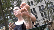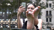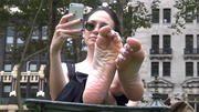 I had seen her sitting on the fountain terrace with her husband for a while and he went off somewhere. She soon went to sit near the lawn and had her gorgeous bare soles propped up, her all-red sneakers (and I do mean ALL-RED) on the ground below her. She wriggled her beautiful, sensual feet all around and caressed them together, like it felt so pleasurable. As I shot she very bashfully peeked at the camera. But she also spent a lot of time looking west, to see if her husband was coming back. Eventually he did but it was about a half hour and I shot most of that time! This is about ten minutes of her rhythmically swaying her bare feet around, rubbing one sole with the big toe of the other foot, or caressing the sides of her feet together as she shyly glances at the camera which is taking the amazing view all in ....