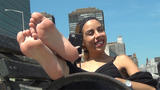 Like for instance this girl sitting on a waterfront esplanade on the East River. When I first passed her she was sitting up more, her bare soles pressed on the bench, talking in Lebanese on her phone (I had a friend in grammar school who was Lebanese and I know what that sounds like, lol) then in English. She was quite a character, very exuberant. I thought, if she lies down I am dying to see what sort of shooting opportunity arises, and I went to a bench a hundred feet or so away and waited to see what would develop. I had barely sat down when she ended her phone conversation and lay down on the bench. She her legs were still bent, her soles still pressed on the bench, but that soon changed as well, and she stuck her legs straight out and crossed her ankles. I strolled over as casually as I could to the bench one down from hers, mercifully open, because if I had sat on the same bench it would have seemed to on top of her, and took my camcorder out, putting in on the bench. I zoomed in on her and her soles were beautiful, about a size 7. She was so pretty and I could see she was on to me basically instantaneously. She seems to have found my interest in her feet very entertaining, as she took pictures of me and wiggled her feet around.