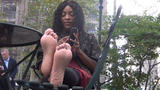 When I got her in my viewfinder I was very surprised to see her feet were still up and now they were rubbing vigorously together, as if she was trying to start a fire. I could see she was looking down at the camcorder, and looking at her friend, and sometimes she had a look of amazement like, "WTF Ashley???" that sort of thing, but interestingly she kept her feet down. I just went with it, sitting there keeping her in my viewfinder, watching the minutes tick by, amazed by my good fortune. Her soles totally took up my viewfinder -- so big -- and her facial expressions were completely classic! I suspect they were visiting because of the stuff they had with them, and this was a freaky experience that she wanted to see unfold, despite the fact that, well, a strange guy was filming her and her bare feet. And so she did. They didn't talk much, but one time she pointed right at me and said, "say hi to him" and they laughed!