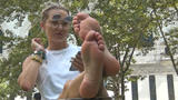 When I got her in my viewfinder I was very surprised to see her feet were still up and now they were rubbing vigorously together, as if she was trying to start a fire. I could see she was looking down at the camcorder, and looking at her friend, and sometimes she had a look of amazement like, "WTF Ashley???" that sort of thing, but interestingly she kept her feet down. I just went with it, sitting there keeping her in my viewfinder, watching the minutes tick by, amazed by my good fortune. Her soles totally took up my viewfinder -- so big -- and her facial expressions were completely classic! I suspect they were visiting because of the stuff they had with them, and this was a freaky experience that she wanted to see unfold, despite the fact that, well, a strange guy was filming her and her bare feet. And so she did. They didn't talk much, but one time she pointed right at me and said, "say hi to him" and they laughed!