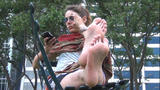 Man what beautiful feet this girl has! And an amazing little body too. I have to admit I got so worked up I hatched the idea to go over and tickle her sole and then ask her the time — which I haven’t done in years (DONT DO THIS AT HOME as they say, it’s VERY WRONG and also DANGEROUS). So I put my phone down, crossed my fingers that my camcorder would capture it, and walked over to her, her squirming bare soles getting closer and closer. I reached down and scrambled my fingernails across the bottom of her foot and she said “WOOOO!” And her feet flew up in the air and she turned to look at me. I said, oh I’m sorry I was just wondering if you had the time, and she laughed, looked further behind her and saw the camcorder, laughed even harder, and told me the time, the whole time giving me this YOU NAUGHTY BOY! look. I thanked her and she laughed again — and went right back to her phone, so as I walked back to my bench I passed the same beautiful feet I had just tickled.