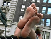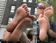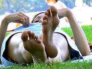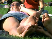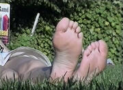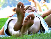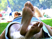 Latest clip added, click my banner below to go to the webstore. This very tall blonde was laying under the shadow of the trees that fringe the Meadow on its eastern edge of the park, chatting with her little brunette friend. She had these hugely long feet, but also nicely shaped, at least a size 11, and that's a conservative estimate -- the kind of feet that go on and on but are not very wide. I loved them! Great arches, nice toe taper, soles in very good shape. So I sat down and took out my camera. She watched me do that, which is moment of truth time before the camera even gets pointed at the feet, but once I aimed straight at her soles she just peeked at me for a moment (as shown in the first cap), then went back to her chat with her friend, periodically flexing her big feet around and recrossing her ankles. Definitely one for the long foot lover -- when she flexed her feet straight up the length of those soles just took my breath away!