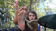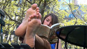 Latest clip, click my banner below to go to the store. This petite brunette had her size 8 feet propped up and wriggling around, but it was lunchtime on the lawn and there were fifty billion people there and she had people sitting pretty close to her. So I had to get closer than usual to shoot this -- if I had leaned my head over I could have stroked her soles with my hair! I took out the camera and began to shoot, which she saw, looked away, then a minute or so later peeked down, arched her eyebrow, then went back to her book, her soft pretty feet wriggling! She would look down periodically over the next 35 minutes but then go back to Zora Neal Hurston, gently rubbing her pretty feet together. She's one of those girls whose tender soles are so soft, you can see it with the naked eye, including tiny wrinkles that cascaded all over her soles as she moved her feet around. This is the best 10 minutes or so of this magical segment.