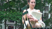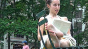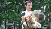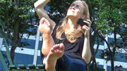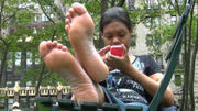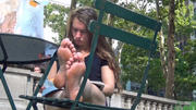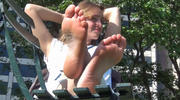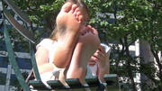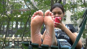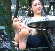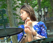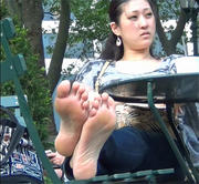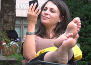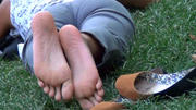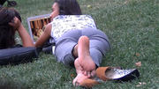 This was shot back in 2012, of a cute little mouseburger who had these incredibly gorgeous bare soles. I saw them from the West Side terrace and did one of those cartoon eyes popping out of head things. Went right over and caught a little over three minutes of her soles, short but very, very sweet. I was worried for a while she didn't know what I was doing despite the obviousness of it, but at the end of the clip she gave the camera a knowing look. I call her a mouseburger because that's the funny nickname that Helen Gurley Brown gave to such girls (including herself) -- cute but needing to work it to get the attention over the flat-out gorgeous girls of this world. I'll tell you, all she had to do was put those bare feet up to immediately become the knockout on the lawn....