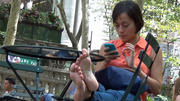 I sat on the ledge around the edge of the grove and began to shoot her. She engaged the whole time in very active foot play, her shapely, beautiful feet, maybe size 8 or so, rubbing gently against each other non-stop. Did she know what I was doing? At the time I really couldn't tell -- she never seemed to look down directly at the camera, well, maybe a few times, but it was really impossible to see through her Gucci (or Chanel?) shades. When I walked past her to get to the ledge to sit in front of her, I noticed she was looking at a portfolio of a very luxurious property, and taking notes.