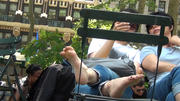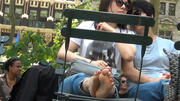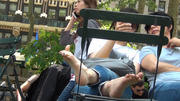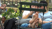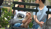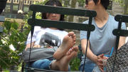 This was a petite woman, about five feet tall, immaculately dressed and appointed, with an expensive bag and a beautiful, tasteful manicure and pedicure. She was an outstanding beauty, reminding me of Madeleine Stowe. And there she was, sitting in the sun, her tan moccasins off, her flawless bare feet up, her high arched soles pointed out! Only one issue was that she had the seat back pointed out opposite her face, which obscures the woman a bit, but you can't have everything. That was the only thing even slightly off about this -- she saw me sit down and she can be seen glancing casually at the camera lens in the beginning of the segment, but then she puts her shades back on and goes back to her texting.