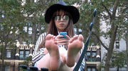 But she did not put her feet down. We sat there for about 25 minutes, the exquisite perfect gem of a woman and the big middle aged guy, her tender, sensitive, beautiful bare soles being lovingly filmed by him as she texted and occasionally peered down at the camera for a moment to see if he was still photographing her foot bottoms. At one point a guy came along and stood behind her and a little to the left and took his phone out -- it was pointed right at her feet and my suspicion is he was taking shots. I edited him out so he would not get dimed out by this clip. lol (Interestingly, when I shot her again in the fall, there was another guy also taking pics of her feet, but that guy made it obvious he was taking pictures and seems to have said something sort of rude to her because she seemed sort of put off by him.) The biggest issue was that the sun was crawling down toward the West Side and that threw a lot of funky shadows on naked soles, and other times must have been hot on her poor little soles, almost burny hot, because they were fairly GLIMMERING with sunlight. Other times the sun shone instead on the area behind her, backlighting her. But I got enough footage in which her soles are perfectly visible to yield this clip!