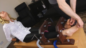 New-girl Dolly gets a first tickle session in the double stocks - her feet are her worst spot and she has some cute and crazy reactions! This scene will be in the store shortly...