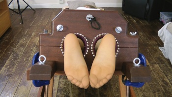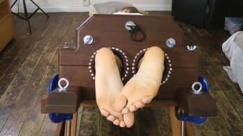 UK Tickling: Gorgeous Rachelle face-down & soles-up in the stocks! (NYLONS, BARE)