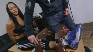 ...Jay being one of the most violently ticklish people around made for a funny scene, with Becky tickling her feet until she literally hit the ground - and then she just carried on while tickling she was stuck on the floor 🙂 The stocks even came off the table and still she kept tickling her! It's a GREAT scene lol